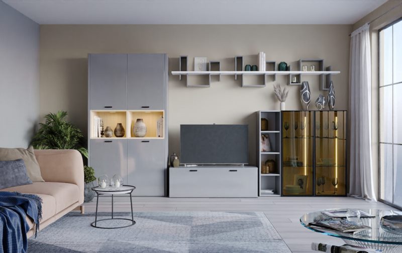 Далее обратите внимание на составляющие – сколько вам нужно шкафов и полок, какого размера и геометрии. Если у вас есть много мелких вещей, то большое количество ящиков будет предпочтительнее. Если же вы желаете разместить разный декор, то должно быть достаточно открытых полок и секций.
